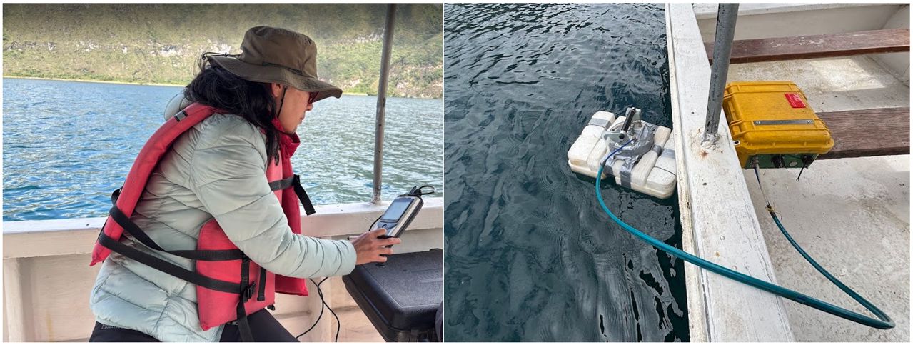 Durante la campaña de febrero de 2026 se llevaron a cabo un total de 104 mediciones de CO2, temperatura y conductividad distribuidas en una malla regular sobre la superficie de la laguna (Fig. 2), en la zona de burbujeo al norte del domo Yerovi se realizaron además mediciones de pH, ORP y muestreo de agua (Fig. 3, izquierda). Al momento de la emisión de esta publicación, los datos están siendo procesados para luego generar el informe correspondiente.