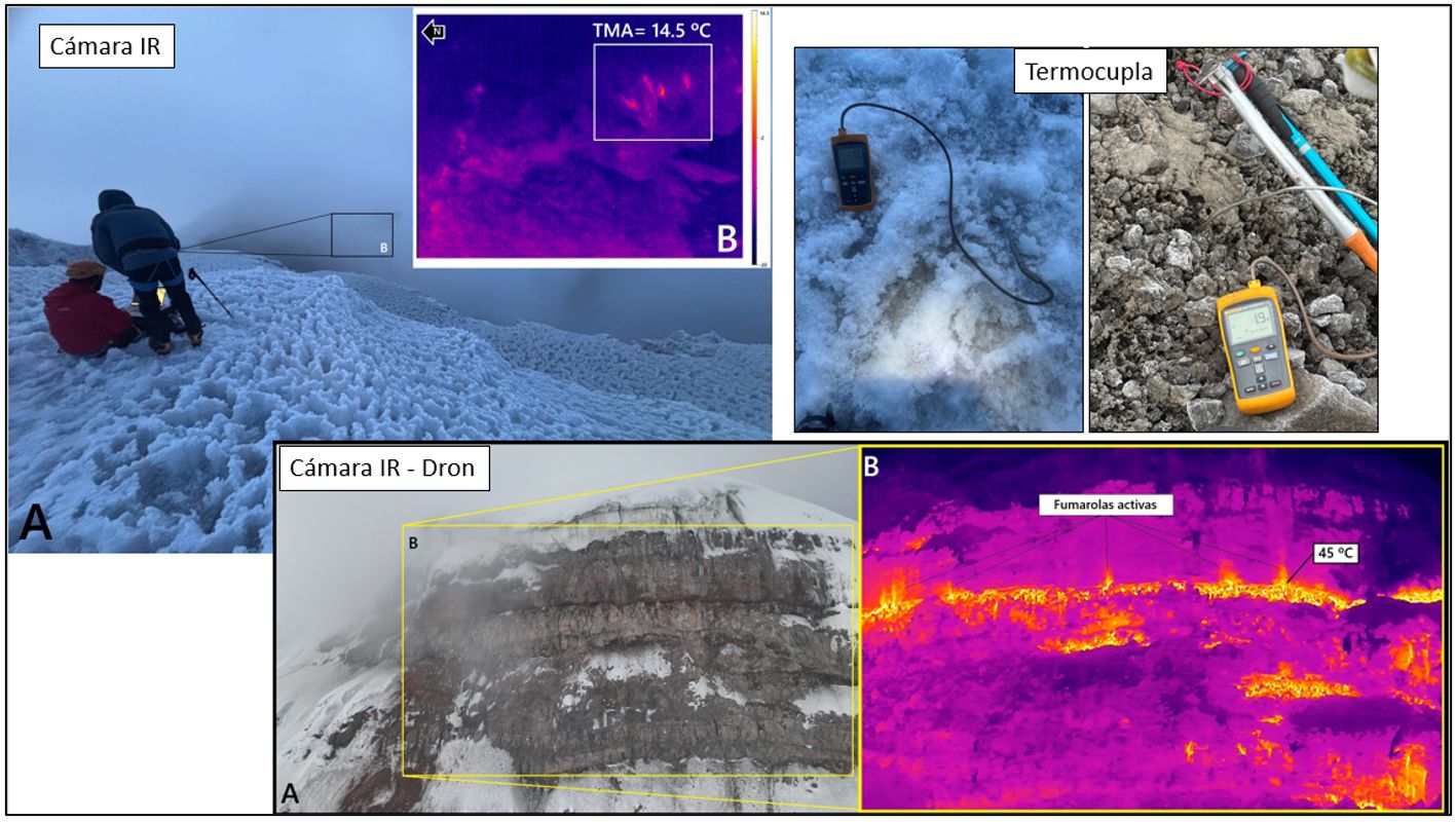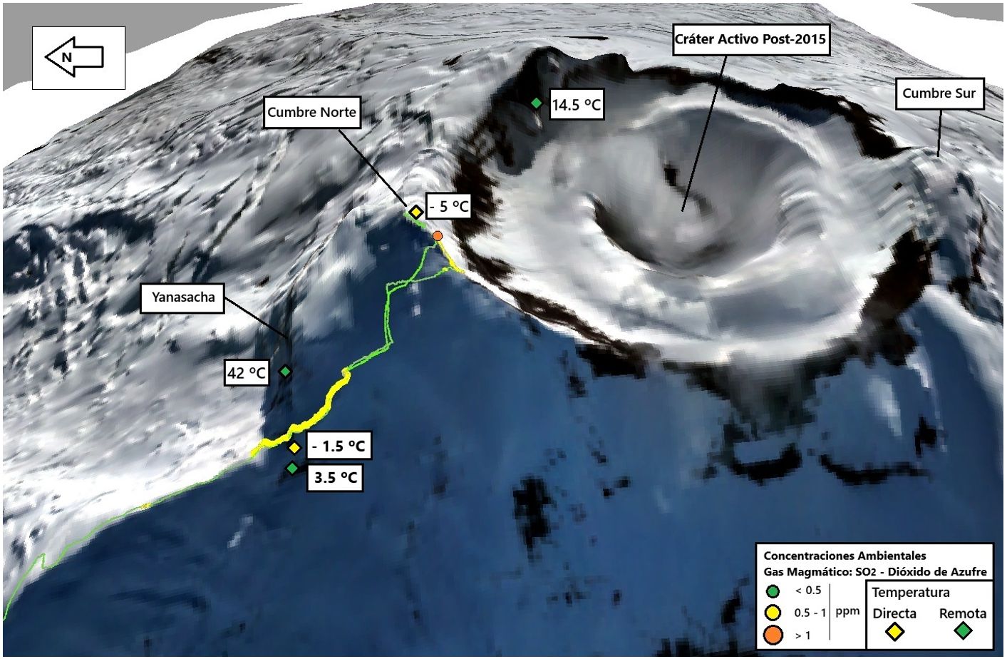 Se realizaron mediciones de temperaturas utilizando diferentes metodologías: directo (termocupla) y remoto (cámara infrarroja). Las temperaturas directas son más fiables, pero son muy puntuales, es decir cubre una zona muy pequeña; mientras que las remotas permiten tener un campo de observación más amplio, aunque están limitadas por las condiciones ambientales (presencia de nubles, humedad, distancia y geometría del cuerpo), por tanto se considera la temperatura máximas aparente (TMA), que suelen diferir ligeramente de la temperatura real. En la cumbre fue posible medir la temperatura del glaciar, con un valor de -5 ºC, similar a la temperatura ambiental, a una profundidad de 0.50 m, La pared interna del cráter en el borde nororiental mostró una TMA-Remota de 14.5 ºC, con volcán nublado, considerándose como referencial, debido a la presencia de nubosidad. El sustrato rocoso en la zona aledaña al campo fumarólico de Yanasacha, en la ruta de descenso, mostró temperaturas de: T-directa= -1.5 ºC; TMA-remota= 3.5 ºC. Todas estas temperaturas pueden ser consideradas como bajas, sin embargo, el campo fumarólico de Yanasacha mostró TMA-remotas y variables entre 28 y 45 ºC, distribuidas en todo el campo. La máxima temperatura se ubica al occidente del campo fumarólico. Se divisaron distintos chorros de gas focalizados, especialmente en la zona del colapso de roca que generó la avalancha del 14 de marzo del año en curso.