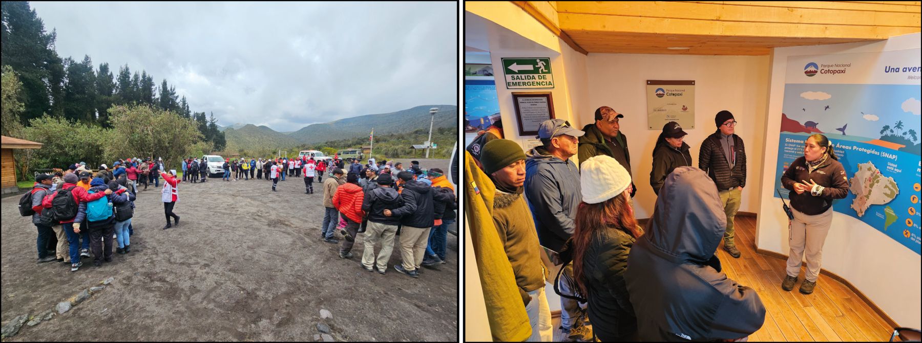 Posteriormente, se realizó la visita a la laguna de Limpiopungo, donde, con una vista panorámica al volcán, se abordó su historia geológica y geomorfológica, explicando los procesos que dieron forma al paisaje actual. Como último punto dentro del PNC, se visitó el Centro de Interpretación Mariscal Sucre, donde el personal de la CRE desarrolló una dinámica de integración, y la guardaparque del PNC ofreció un breve recorrido por las instalaciones.