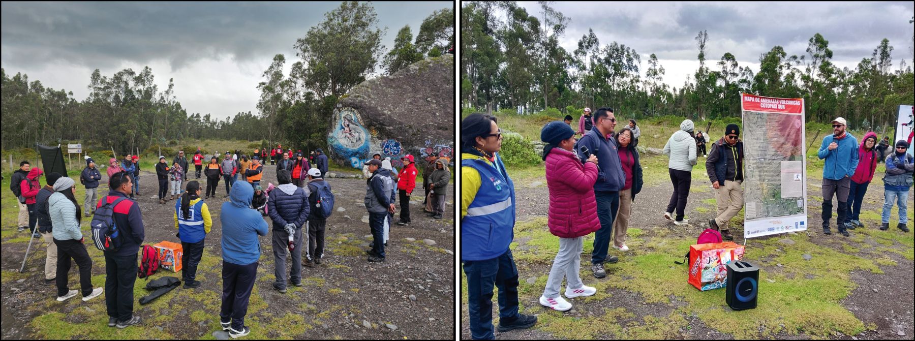 En la tarde, tras salir del PNC, se visitó el sector de la Piedra Chilintosa, en Mulaló, donde se explicó el origen de esta formación y los mitos que han surgido en torno a ella. Además, se reforzó la información sobre los posibles impactos de los flujos de lodo o lahares en la zona. Posterior a esto, se realizó la visita al Centro de Información e Interpretación del GAD Parroquial de Mulaló, donde miembros de la comunidad compartieron explicaciones relacionadas con el Volcán Cotopaxi y su influencia en el territorio.